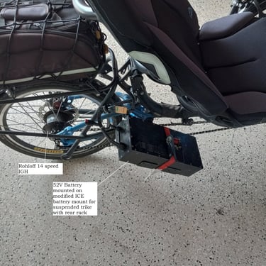 As you know recumbent trikes and some recumbents are somewhat unique in that although they use the same components as a regular bike, many of the accessories are not recumbent friendly. One component which I have fallen in love with is my Rohloff Internal Geared Hub which I installed when the Shimano Capreo hub which originally was installed on my ICE (allowed a 9T cog for use with the 20” wheel to give the performance of having a larger wheel) failed and found that the component had been discontinued. After much research I had narrowed down my replacement to the Rohloff, or the Shimano IGH. I chose the Rohloff as it had even steps (13%) between gears and a greater overall range (526%) and a higher input maximum torque (139Nm) As it turns out this is probably the best $2k I’ve spent in a long time. I have found with a mid-drive motor that if you have proper gearing (2 x 9 on the LoGo or the Rohloff on the ICE), and use it, the motor seems to love it when you can operate with a pedal cadence between roughly 70 – 90 rpm. Other accessories which are somewhat unique are battery mounts (desire is to keep weight low), mounts for displays, throttles, keypads, etc. TerraCycle in Portland OR makes all types of mounts which can be used primarily on recumbents, I use several to mount my accessories. I mentioned the mounting of a derailleur for use with a mid-drive and double chain ring, Origin8 makes an adapter with a spacer which allows the derailleur to properly operate with two chain rings. One final addition was to present a cleaner appearance as there are several unsightly wires running the length of the boom, I achieved this by installing a piece of ballistic nylon material with Velcro enclosure to hide the wiring. The material is available from Wire Care and sold as Dura Wrap https://www.wirecare.com/interest/networking/cable-bundling/dura-wrap, the material is available in 3 foot lengths and different widths (boom diameter with wires) so that you can have a tight tidy look when you are done. I like the material as it is closed with a Velcro strip and small slits can be cut in one side which will allow the material to easily be placed around obstacles such as water bottle bosses on the boom.